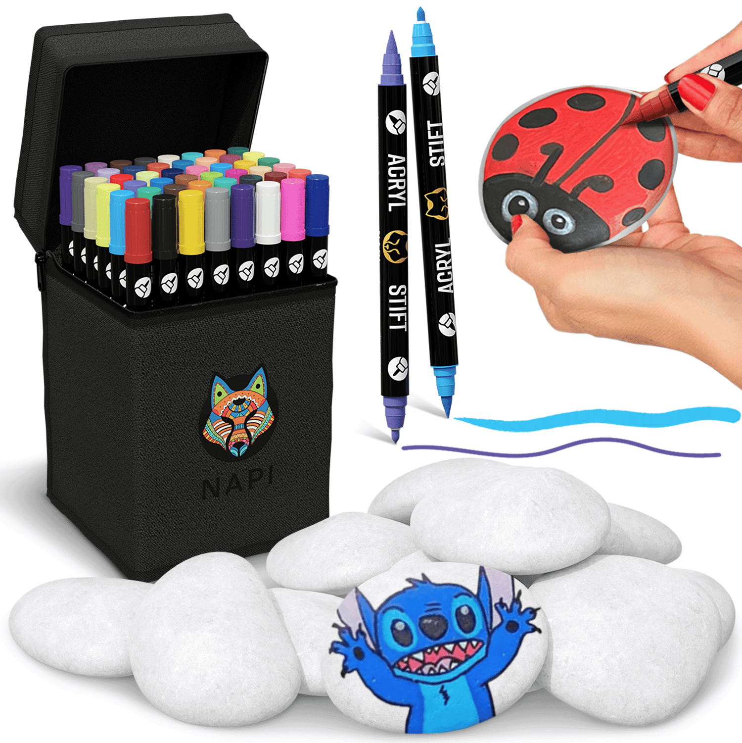 NAPI Happy Stones – Set van 12 Witte Stenen & 48 Acrylstiften